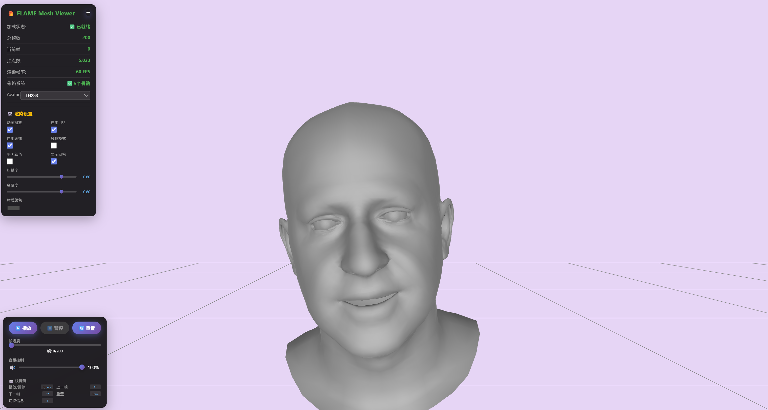 A real-time 3D facial animation player based on WebGL/Three.js, supporting parametric driving of the FLAME model. It implements the full LBS deformation pipeline, enabling high-quality animation generation by adjusting shape, expression, and pose parameters.